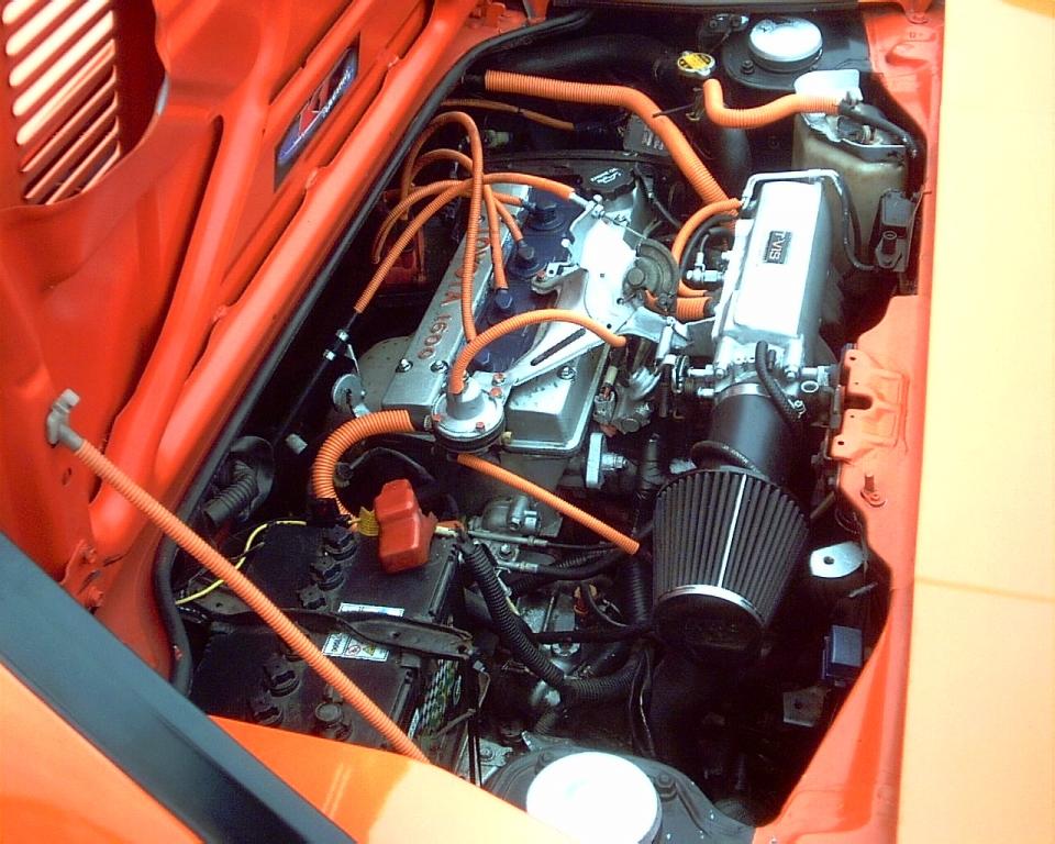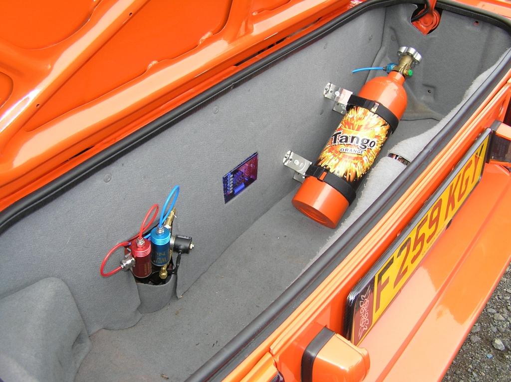 | Exterior: Full custom colour re-spray in orange pearl, rare style-auto full body kit, window tints, rota slipstream alloys 16", custom S.S. twin exit exhaust, spotlights, micro cruise lights, new wheel arches all round, custom front grille, custom rear spoiler with LED brake light, tinted rear lights, limo-tinted T-bar glass. Under car LED multi-colour multi-function lighting. Personal number plate ‘D16 NOS’ (DIG NOS) Chassis: Lowered on 30mm Apex springs, koni adjustable shocks, black diamond drilled and grooved brake discs, EBC greenstuff pads front, kevlar fast road pads on rear, Engine: Std twin cam 16V 1600 4AGE engine, K&N induction air filter, FSE fuel boost valve, orange vaccuum hoses, magnex performance ingition leads, Wizards of NOS nitrous kit with resprayed orange bottle in rear boot, Dynotune Twin purge kit - vents thru rear engine lid vents illuminated with red LED’s, painted cam covers and accelerator bracket to match bodywork. Custom stainless exhaust with twin exit 3” pipes. Interior: Custom leather re-trim in orange and black, custom brushed steel facia plate with extra switches, Sony xplod cd player, pioneer 10cm front speakers, infinity 3.5" rear speakers, JVC active bass tube behind passenger seat (leaving room to store t-bar glass), original t-bar covers behind seats, orange tango doll mascot, ‘Rhons’ custom leather gear gaiter with orange stitching, orange gear lever, momo corsa steering wheel, |