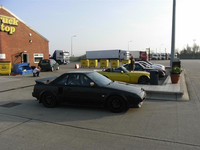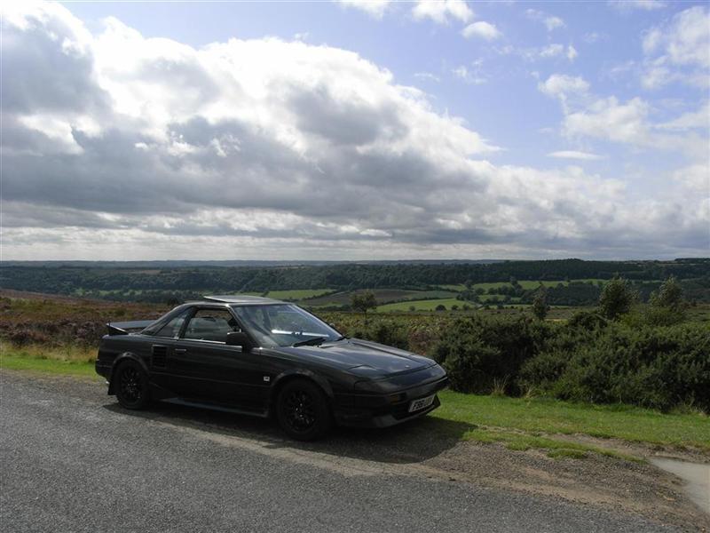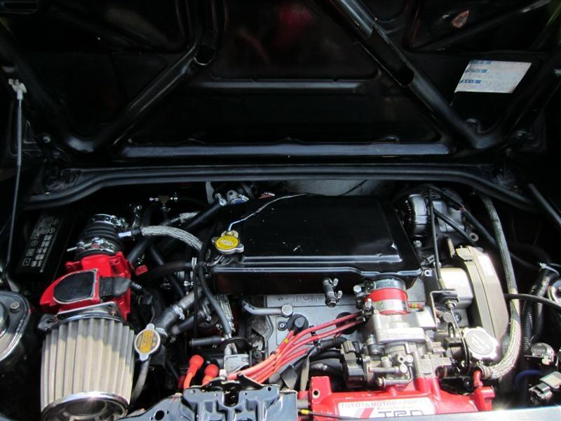 Mk1 MR2 with a Woodsport engine conversion. 2 litre Mk2 MR2 Rev2 3S-GTE turbo engine with hybrid stage 2 CT-26 turbo, de-catted, Apexi induction kit, custom stainless steel exhaust, Celica ST205 chargecooler, oil catch can, LSD gearbox, Blitz electronic boost controller, HKS FCD, fully polybushed, uprated ARB's, 310mm ally bell 2 piece discs with 4 pot Hi-Spec calipers on the front, Mk2 MR2 turbo rear calipers with VW Corrado 280mm front discs on the rear, Goodridge stainless steel brake hoses, DOT 5.1 fluid, 1" brake master cylinder, Team Dynamics Pro Race 1.2's, Koni adjustable suspension, lowered 35mm, custom gauges, heads-up display speedo, bucket seats with CG locks, Momo steering wheel... and no stereo!
